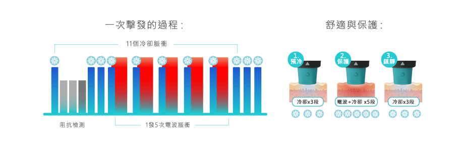 自動檢測每一發能量輸送到肌膚前的電阻,同時自動監測皮膚溫度之變化,確保容積式加熱功能精準且安全地到達真皮層,迅速刺激膠原蛋白新生,達到提升緊緻、飽滿輪廓、除皺、嫩膚等效用。